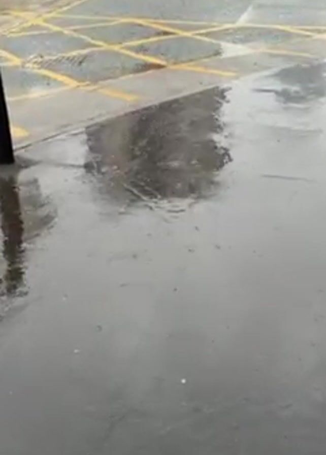 wet urban street on a rainy day. The asphalt is dark and glistening with puddles, reflecting the surrounding buildings. Raindrops are visible, creating small ripples on the surface of the water. There are yellow painted traffic lines on the road, and a black and yellow bollard stands at the edge of the street. In the background, there is a pedestrian bridge and some indistinct buildings. The overall atmosphere is dreary and gray due to the rain.