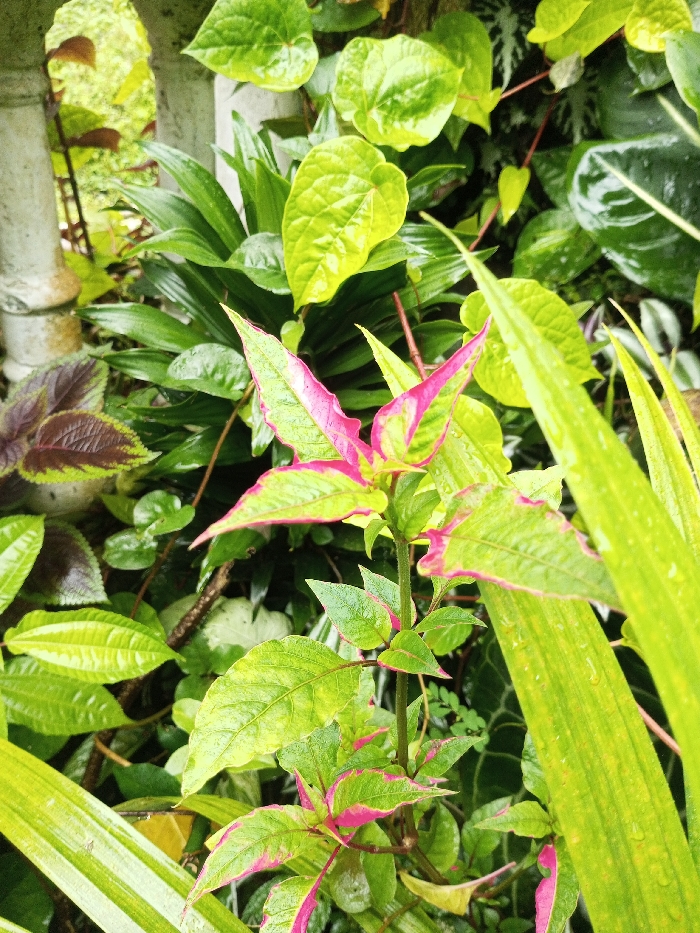 A vibrant collection of lush greenery dominates the frame. Leaves of varying shapes and sizes create a dense tapestry. Dominating the view is a plant with green leaves edged in pink, its pointed form draws the eye. Broad, rounded green leaves fill the upper portion, while long, slender leaves stand erect on the right. A glimpse of a weathered white pillar sits on the left, hinting at a garden setting. Raindrops glisten on some foliage.
