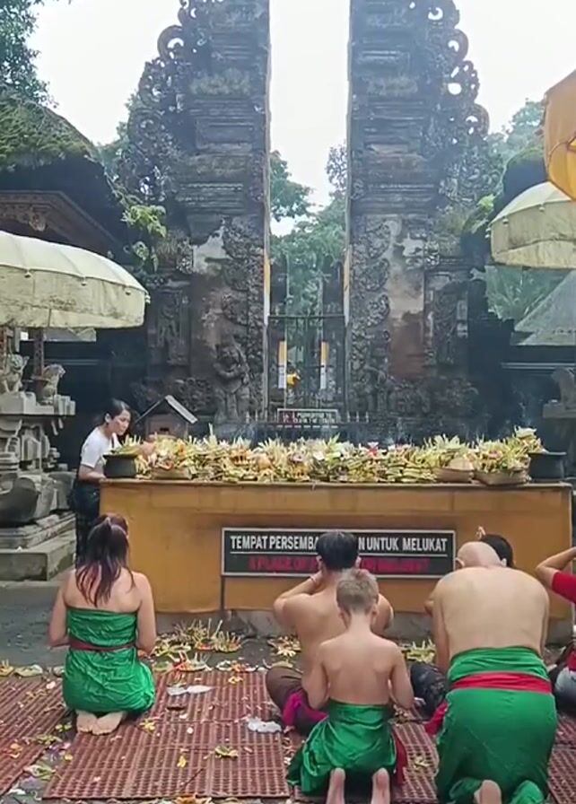 Several people, including adults and a child, are kneeling on a patterned mat in what appears to be a religious setting. They are facing a stone structure with an open doorway. Most of the people are wearing green cloths around their waists or as skirts, leaving their upper bodies bare. A woman in a white shirt and patterned skirt stands to the left, handling objects on a yellow platform. The platform is covered with arrangements of yellow flowers and other items. A sign on the platform reads "TEMPAT PERSEMBAHAN UNTUK MELUKAT" and "A PLACE OF MELUKAT". The scene is surrounded by greenery and parts of buildings, and the sky is overcast. The overall impression is of a ceremony or ritual taking place in a traditional Balinese temple.