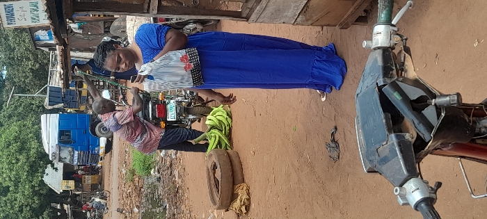 The image depicts an unpaved, reddish-brown dirt street scene in Ankpa, Nigeria. In the foreground, the partially disassembled or damaged handlebars and front cowling of a red scooter are visible. To the right, a woman with braided hair, dressed in a long, ruffled blue gown and white flip-flops, stands holding a white and blue striped bag with a red bow pattern in her left hand, while looking at a smartphone held in her right hand. Adjacent to her is a wooden stall with a corrugated metal roof, displaying a blue sign that reads "PERMANENT SIKUJA SUNDAY SALON." In the mid-ground, a man with a shaved head, wearing a patterned short-sleeved shirt and dark trousers, leans over a silver motorcycle with Nigerian license plate LGL 956G. On the ground near the motorcycle, a pile of green plantains or bananas is visible next to two large, circular, rusted metal objects. Further back, a partially obscured man is seen near a structure, appearing to hold a long, dark object. In the background, a blue and white semi-truck is present, along with additional motorcycles and indistinct figures, set against a backdrop of trees and various small buildings. The scene conveys a busy, open-air commercial environment.