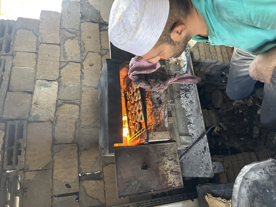 A man wearing a white hat is seated on the ground, facing a wood-fired oven. The oven is loaded with round pastries, being baked over a fire. The man's left hand rests on his lap, while his right hand is near a pink cloth draped over the oven's edge. The environment is a brick building with a dirt floor. The man is wearing blue pants and a teal shirt. There are various pieces of debris and a metal tray on the ground nearby. The man appears to be monitoring the pastries in the oven.
