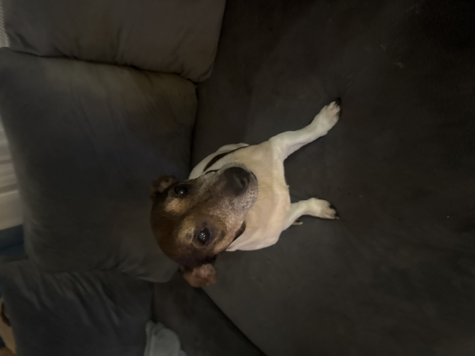 - "A brown and white dog, consistent with a Jack Russell Terrier, is seated on a dark grey fabric sofa in an indoor residential setting within Rostov-on-Don, Russia" by FM-UGHZD2, licensed under CC BY 4.0