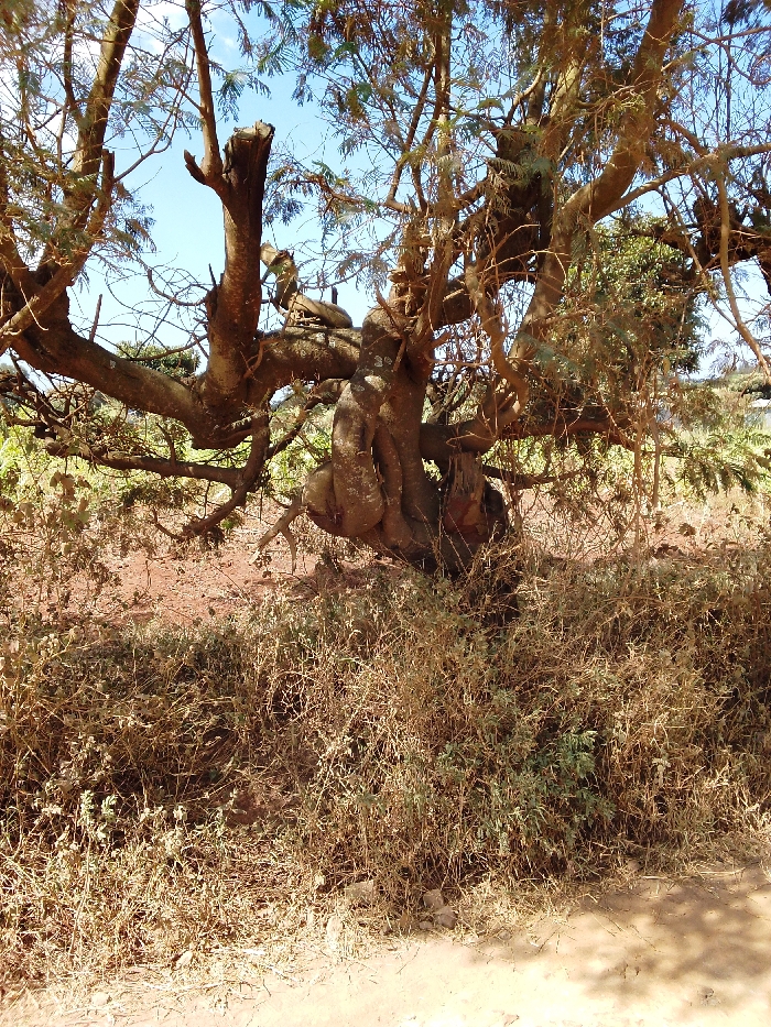 The image displays a prominent, large, gnarled tree situated in Ndeiya, Kenya