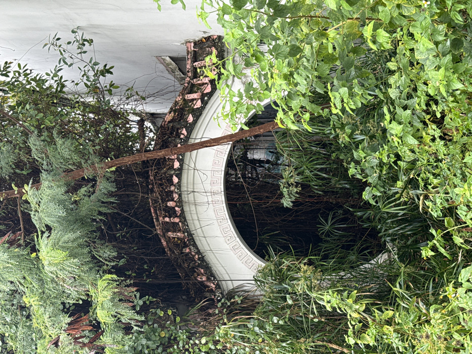 An overgrown architectural feature is visible in Nha Trang, Vietnam. The central subject is a white, arched structure with a relief pattern resembling a Greek key design along its inner curve. Above the arch, a traditional-style balustrade or roofline with reddish-pink, scalloped tiles is partially obscured. Dense, green tropical vegetation, including large-leafed plants, ferns, and numerous hanging vines and roots, extensively surrounds and covers the structure. A light brown tree trunk leans diagonally from the upper center, partially obscuring the arch. To the right, a plain, light-colored wall of a building is visible, also showing signs of weathering and some creeping vegetation. The scene depicts a structure being reclaimed by natural overgrowth. No individuals or active subjects are present.