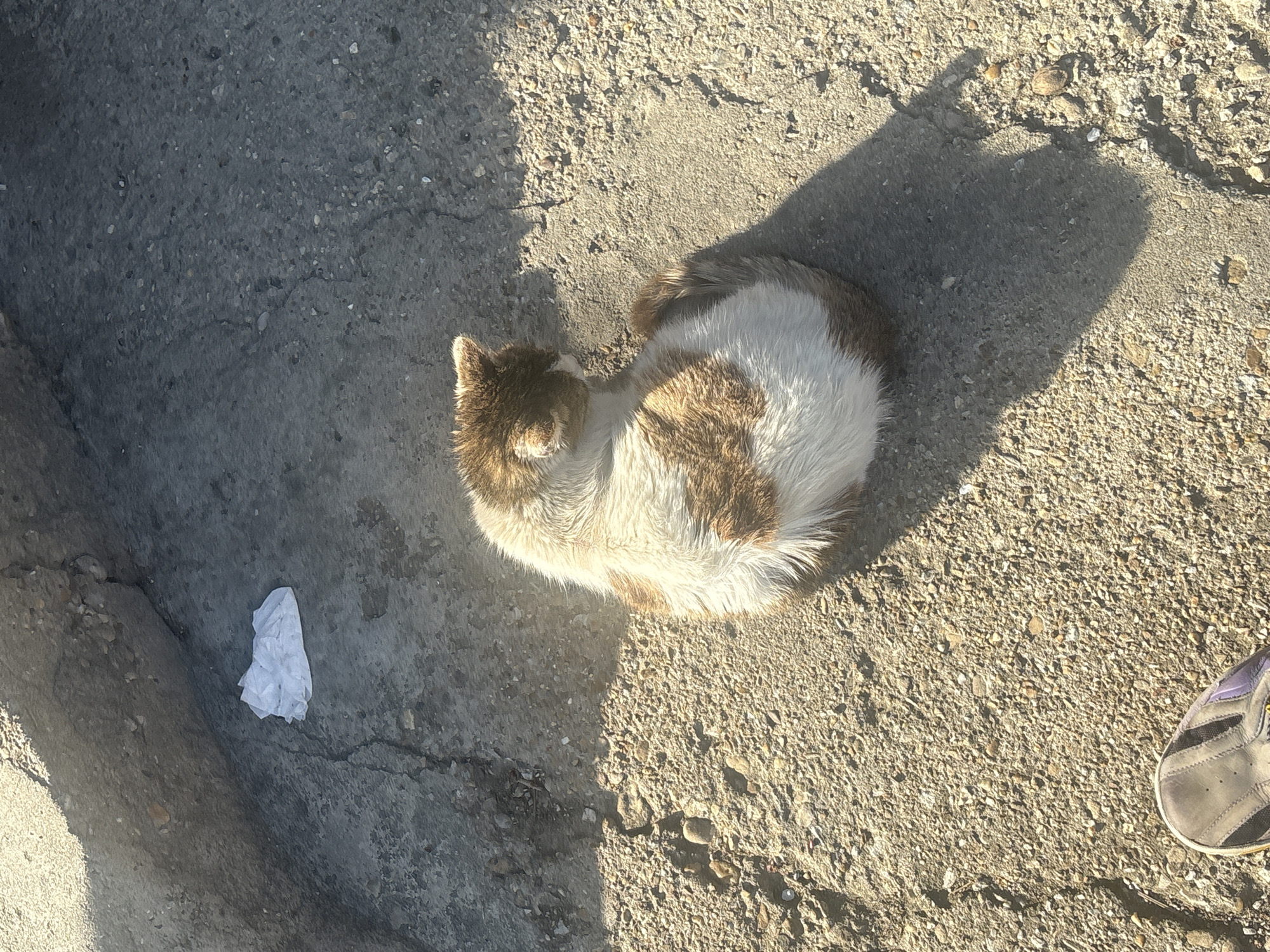 A high-angle shot shows a brown-and-white cat curled up on an urban sidewalk in Gorna Oryahovitsa, Bulgaria. The sidewalk is cracked in places and varies in texture and color. A piece of crumpled white paper is visible to the left of the cat, and the toe of a gray shoe can be seen in the lower right corner of the frame. The scene is bathed in strong sunlight, casting distinct shadows.