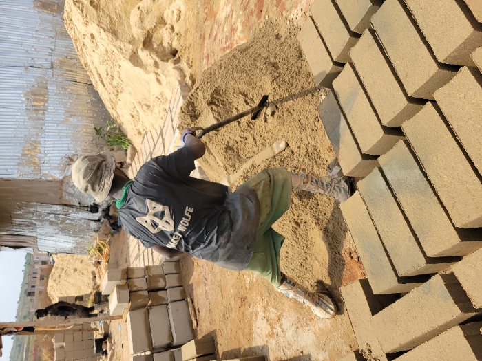 The scene depicts a construction material preparation area in Nwofia, Nigeria