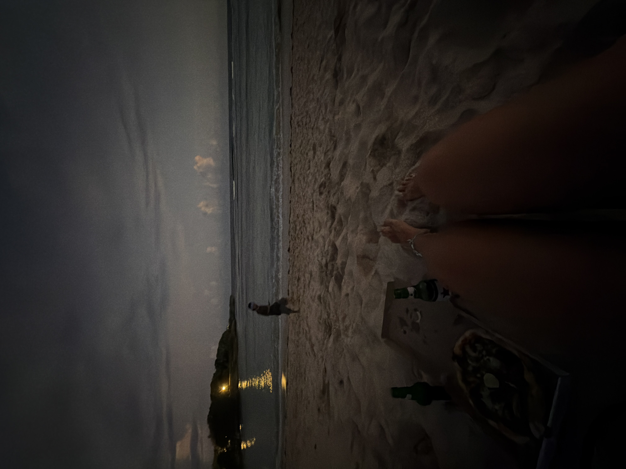 The image depicts a night scene at a beach, potentially in Nusa Dua, Indonesia, given the coastal environment. The sky is dark and cloudy, with a visible shoreline. A dog is present on the beach near the water. A person's legs and feet are visible in the foreground, along with a tray containing food, including what appears to be a pizza, and several green bottles, possibly containing beer. The setting is dimly lit, with some lights visible in the distance, potentially from buildings or street lamps.