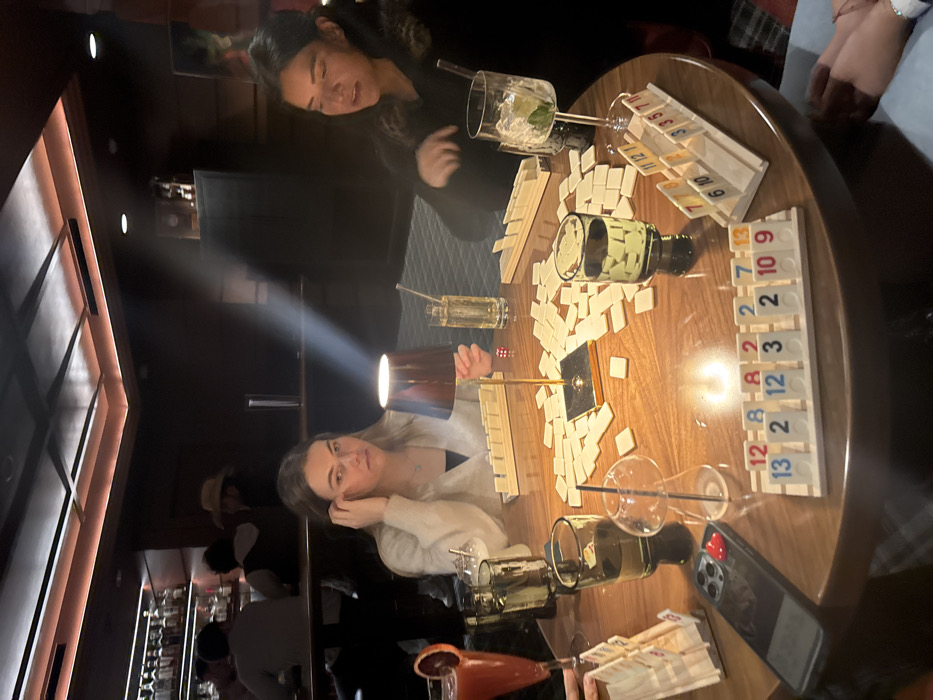 Two women are seated around a round table, seemingly playing a game of Rummikub. The table is cluttered with tiles and drink glasses. A small lamp illuminates the scene. The woman on the right has dark hair and is wearing a black sweater. The woman on the left is wearing a white cardigan and has her face resting in her hand. A bar with other patrons is visible in the background. A cell phone is on the table.