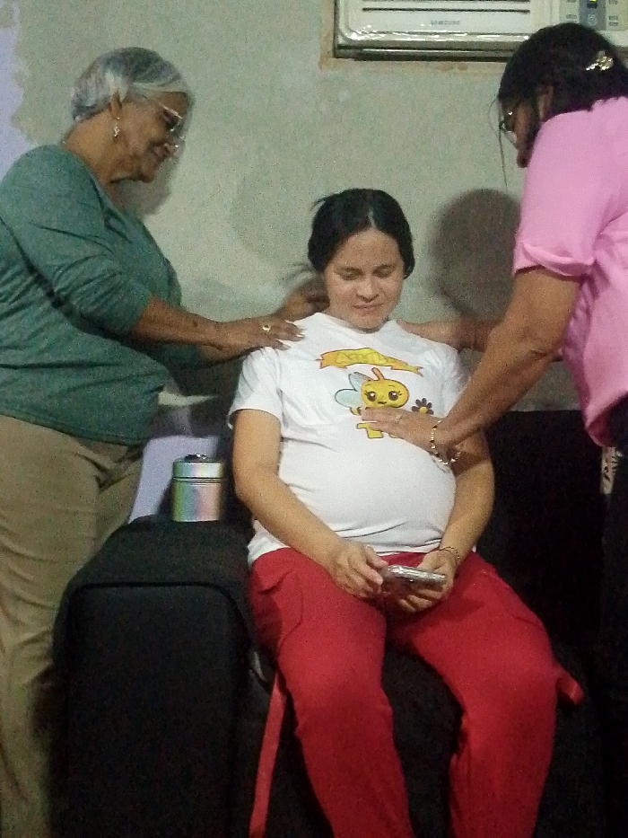 A pregnant woman sits, looking at a cellphone she holds in her hands, while two older women rest their hands on her shoulders and stomach. The woman in green stands to her left, and the woman in pink stands to her right. The pregnant woman wears a white shirt with a cartoon bee and red pants. A black bag sits to her left with a round, silver container on top. The background is a gray wall with an air conditioning unit at the top.