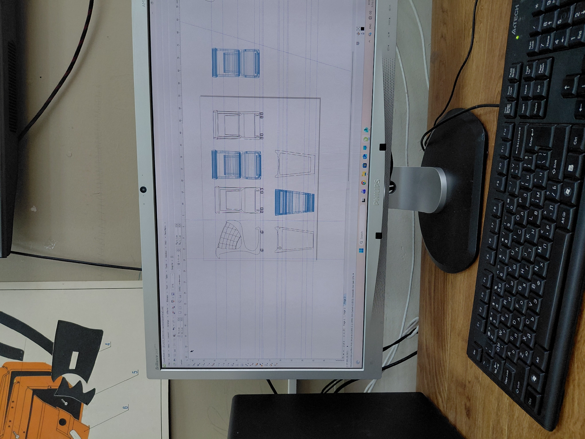 desk setup. On the desk is a silver Philips monitor displaying a technical drawing with chair designs. Next to the monitor is a black A4Tech keyboard. Also partially visible is a sheet of paper with a schematic of an orange mechanism, labelled with numbers. The environment appears to be an indoor workspace. There is no information to determine a location in Kazanlak, Bulgaria.