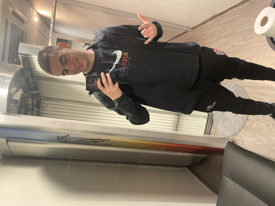 A young male, appearing to be in his late teens, takes a mirror selfie inside what appears to be a tanning salon in Sofia, Bulgaria