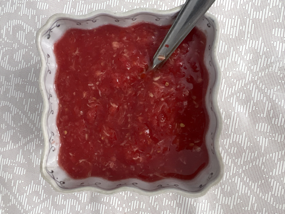 An overhead, close-up view displays a white, square-shaped ceramic bowl with scalloped edges and a subtle dark blue or grey decorative pattern along its rim. The bowl contains a bright red, viscous substance with visible lighter-colored fibrous fragments and small seeds, consistent with a chunky sauce, relish, or jam. A metallic, silver-toned spoon is partially submerged in the substance, its handle extending diagonally towards the bottom right of the frame. The bowl rests upon a white or light-colored tablecloth featuring a repeating, subtle geometric pattern. No individuals are visible. The scene is located in the city of Пугачёво, Russia.