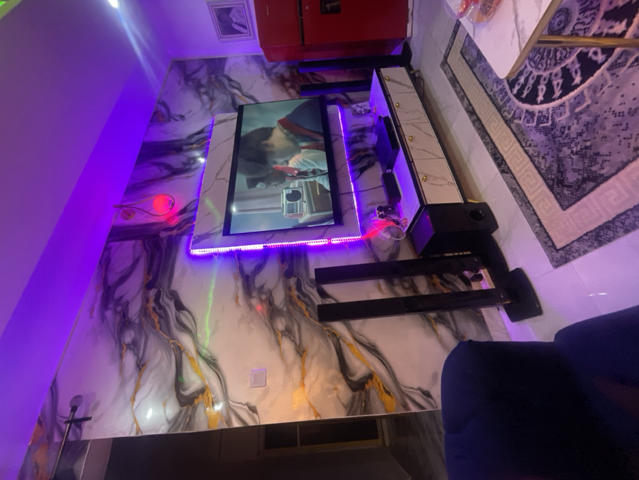 A modern living room features a television mounted on a marble-patterned wall with purple LED lighting. Nearby is a marble-topped TV stand with gold accents, accompanied by black speakers and two dark-colored shelves. A patterned rug is partially visible under a white coffee table. In the corner, a red refrigerator stands. The room is illuminated with a distinct purple hue.