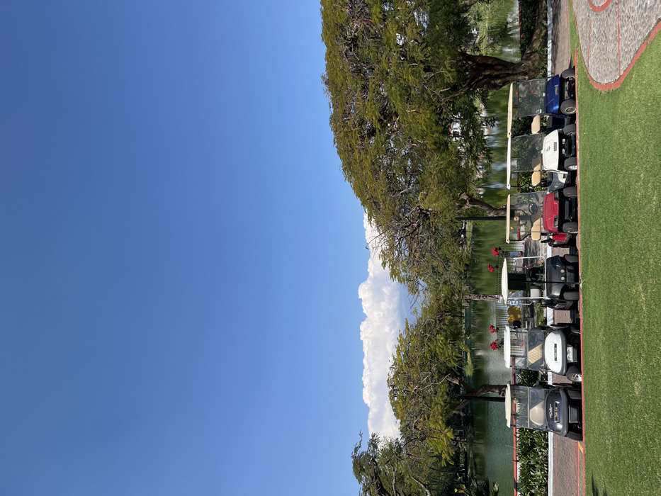 Golf carts of varying colors line a paved area beside a water feature. Trees frame the waterway, with visible red flowers and a fountain. Lush green turf borders the pavement. A bright blue sky dominates the left side of the image, with a large cloud formation subtly appearing near the trees.