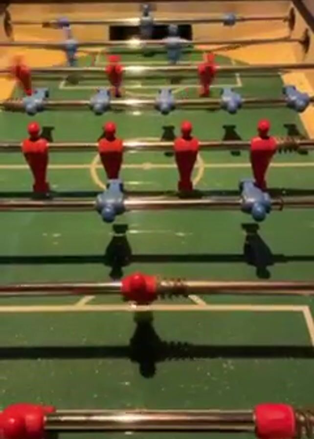 The scene features a foosball table with red and blue player figures. The figures are mounted on horizontal rods that span the table. A foosball game is in progress. The backdrop is a plain, possibly painted wall. There’s an indistinguishable light source creating shadows of the foosball men on the table. The camera angle is positioned directly above the table, providing a bird's-eye view of the foosball game.