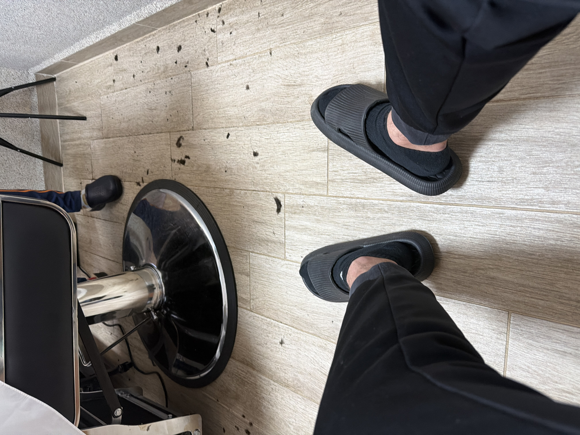The scene depicts the interior of a hair salon or barbershop in Kavarna, Bulgaria. The vantage point is from the perspective of an individual's lower body, showing dark trousers, black socks, and black slides. The floor consists of light-toned, rectangular wood-effect tiles, extensively covered with dark, short hair clippings. In the left midground, the base and lower sections of a black hydraulic barber chair with a chrome pedestal are visible. A white cape drapes over the chair, partially visible in the upper left. Partially obscured beneath the barber chair, another individual's lower leg is visible, clad in dark blue athletic wear with an orange stripe and dark blue or black clog-style footwear. A black tripod stand is situated against a light grey, textured wall on the right side of the frame.