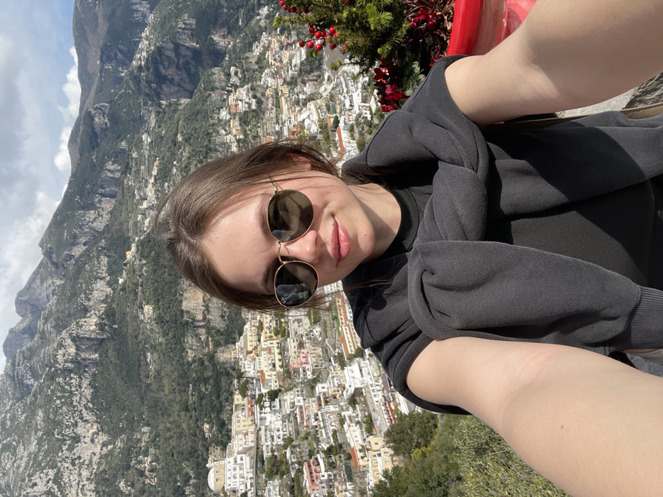 A young adult female with brown hair and light skin captures a selfie from an elevated vantage point overlooking Positano, Italy