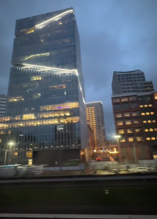 nighttime view of buildings from a moving vehicle. The buildings are illuminated with lights. One of the buildings is a modern high-rise with a unique architectural design and the name "DENTONS" prominently displayed. The sky is cloudy and dark. The foreground includes a blurry view of a road and a grassy area. A street light is also visible through the car window. There are no people visible in the video.