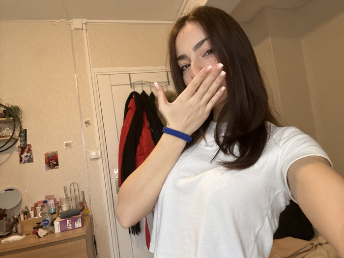 The image depicts an indoor scene, likely a private residence, such as a bedroom or studio apartment. There is no discernible visual information within the image itself to confirm a specific location within the city of Strasbourg, France. The primary subject is a female individual, positioned in the foreground, capturing a selfie-style photograph. She has long, dark brown hair and is wearing a plain white short-sleeved t-shirt. Her left hand is raised, covering her mouth and part of her nose. Her fingernails are visible, featuring a white tip manicure. A blue elastic band or simple bracelet is worn on her left wrist. She is looking towards the camera with a slight smile visible in her right eye. The background reveals a room with light-colored, possibly textured, walls. White plastic conduit runs along the upper wall and ceiling. To the right of the subject, a white door is visible, on or near which a red puffy jacket and a dark garment with fringe are hanging. To the left, a wooden dresser or vanity table is present, cluttered with various items. These include a round mirror, cosmetic bottles, jars, brushes, a clear plastic container, a blue water bottle, tissues, a small red object, and a cardboard box. A decorative green cactus-shaped object is also on the dresser. Above the dresser, a small wooden shelf holds additional items. Several small square pictures or postcards are taped to the wall, and a circular metal object hangs nearby. The overall lighting appears to be artificial, illuminating the scene from the front or above.