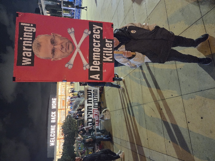 A protester holds a red sign displaying a man's face with crossed bones, labeled "A Democracy Killer" and "Warning!" The scene is outdoors at night, with a crowd and illuminated structure in the background