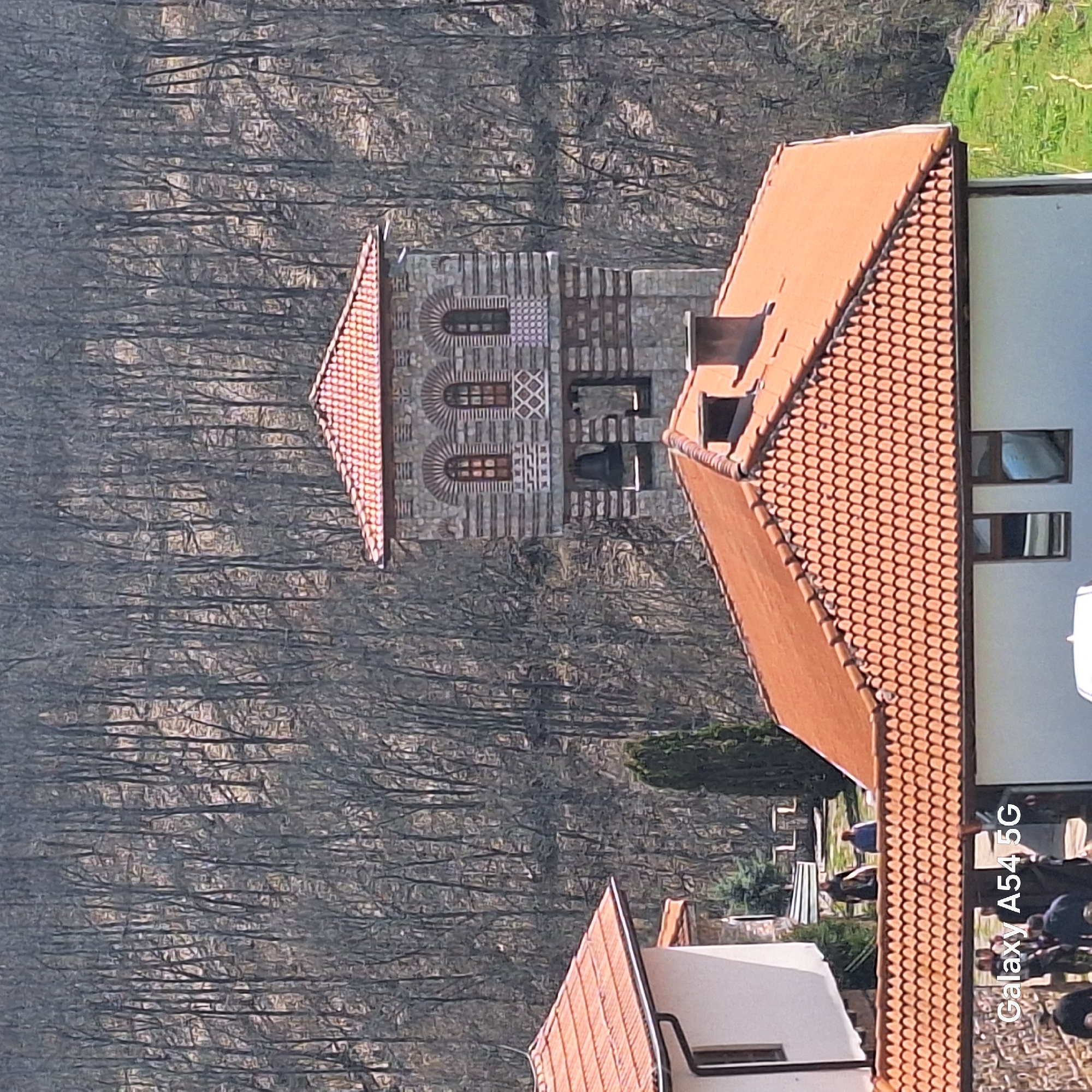 stone bell tower with a red-tiled roof standing behind a building also with a red-tiled roof and white walls. Both buildings are situated in Gigintsi, Bulgaria. The tower has arched windows and decorative stone banding. In the foreground, a gathering of people is visible near the building. The background is filled with a dense forest of leafless trees.