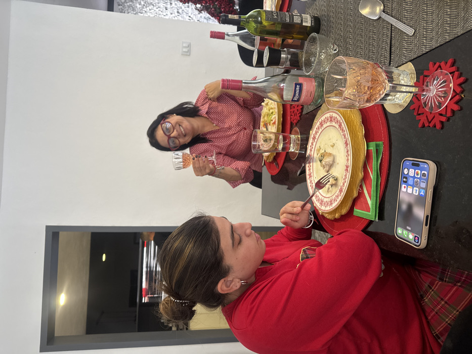 Two women are at a dining table set for a meal with festive decorations. One woman, wearing a red shirt, eats with a fork while looking down. The other woman, wearing a red patterned shirt and glasses, holds a glass of wine and smiles. Bottles of wine, glasses, plates with food, and a phone are visible on the table. The setting suggests a holiday or celebratory dinner.