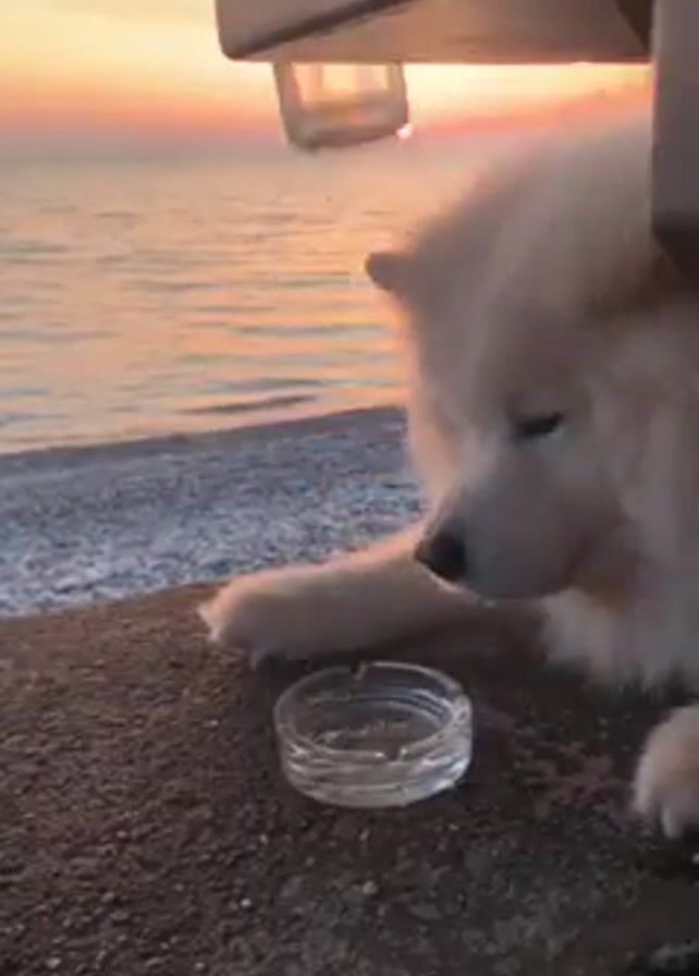 The scene takes place outdoors, presumably on a concrete structure next to a beach, as suggested by the gentle waves in the background. The sky shows a gradient of yellow, orange, and pink hues, indicating either a sunrise or sunset. A white, fluffy dog sits with its paws resting on the concrete. A hand reaches into the frame and sets down an empty drinking glass, previously used to fill a small, circular ashtray with water. The dog proceeds to lap the water from the ashtray. A wooden structure, perhaps a table, partially obscures the upper part of the frame.