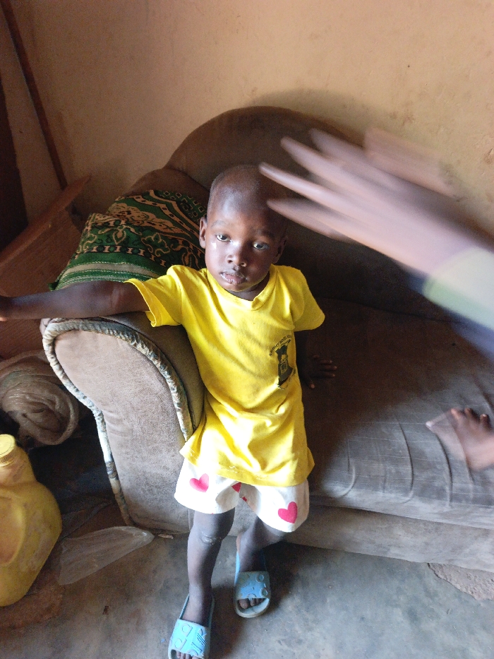 The image displays a young, dark-skinned child standing indoors in Akwanga, Nigeria