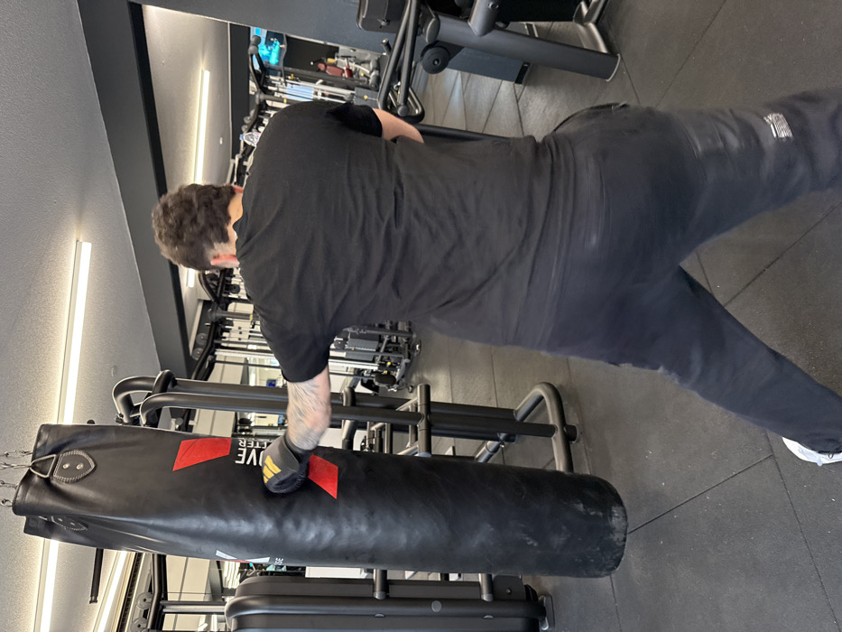 An adult male is depicted from behind, mid-action, punching a heavy bag in a gym located in Geispolsheim, France