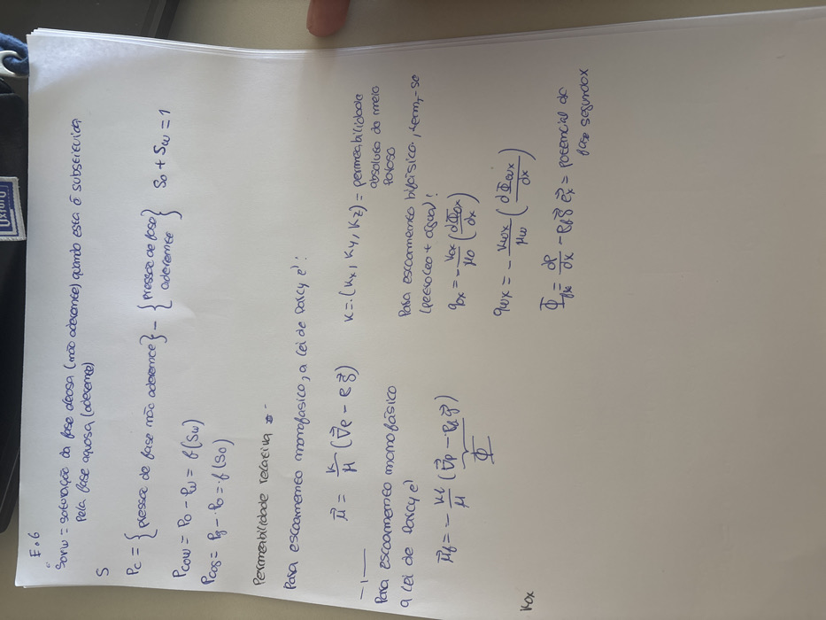 A close-up, high-angle indoor photograph depicts a stack of white paper containing handwritten notes in blue ink, primarily consisting of equations and definitions in Portuguese related to fluid dynamics or reservoir engineering