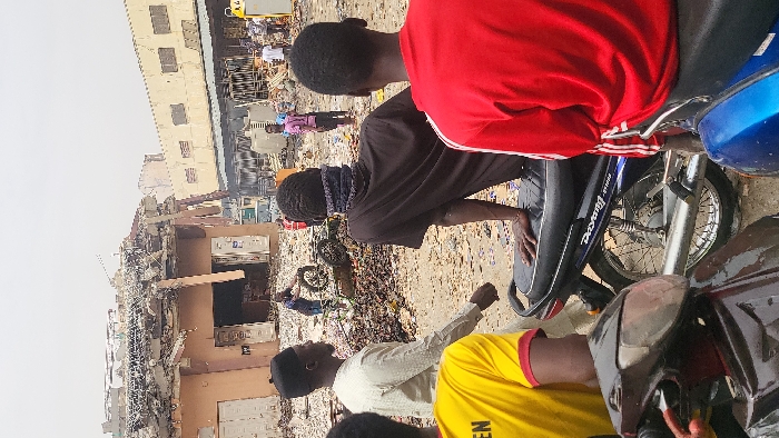 The scene depicts a devastated urban area in Fagge C, Nigeria, under daylight conditions. In the foreground, from right to left, an individual in a red long-sleeved shirt with white stripes is seated on a blue scooter. Adjacent, another individual in a dark short-sleeved shirt and a patterned neck gaiter leans on a dark blue "DAYANG DX125" motorcycle, both facing away from the camera towards the debris-strewn background. Partially visible on the far left is an individual in a yellow t-shirt. The mid-ground reveals extensive destruction. A two-story building on the left exhibits severe structural damage, with its upper floor partially collapsed, exposing interior elements and debris scattered on its roofline. Its ground level features closed shop fronts. The area directly in front of this building and extending across the mid-ground is covered in a dense layer of rubble, shattered materials, and assorted debris. Within this area, a male individual wearing a light-colored long-sleeved garment and a dark cap walks right-to-left, observing the damage. Further into the debris, another male in a blue shirt is actively manipulating a two-wheeled cart. In the background, a long, light-colored building with multiple windows or openings spans the right side, with additional debris or stacked items visible in front of it. Several other indistinct figures are sparsely distributed across the mid-to-background, moving or standing amidst the wreckage. The overall atmosphere appears hazy or dusty.