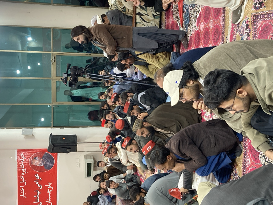 The image depicts an indoor gathering of approximately 30-50 men in Quetta City Tehsil, Pakistan