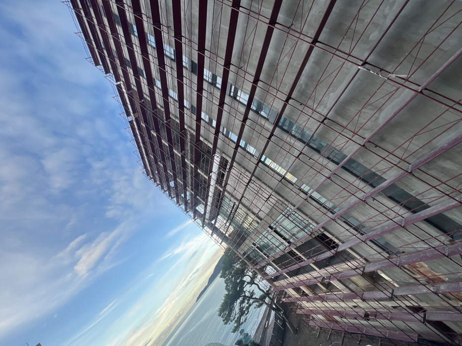 A tall building is covered in scaffolding from top to bottom. The building has many windows that are reflecting the sky. In the distance, there is a body of water and a tree. The sky is blue with some white clouds. The building is gray and appears to be under construction or renovation.