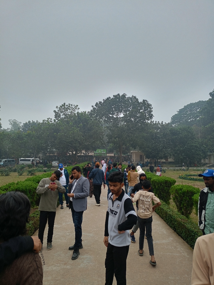 The image displays an outdoor scene on an overcast day in Bogura, Bangladesh. A light-colored paved pathway, flanked by green, manicured hedges, extends from the foreground into the background. Approximately twenty-five individuals, predominantly adult males and male youths, are observed on and around this pathway. In the immediate foreground, a person with dark hair is partially visible from behind on the far left. To their right, a young male in a grey and black long-sleeved shirt with "RED DRAGON" text stands facing slightly right. Adjacent to him, a man in a light grey suit jacket, blue jeans, and black shoes holds a mobile phone to his right ear. Further left, a young male in an olive green long-sleeved shirt stands looking down at a mobile phone in his hands. On the far right, a male wears a blue cap and a light green jacket. A young male, dressed in a light brown long-sleeved shirt featuring a skeletal graphic on the back, walks away from the camera in the mid-right. The midground and background contain additional individuals walking and standing. Dense green foliage, comprising large trees and bushes, forms the dominant background element. Several vehicles, including a white van, are visible on a road in the far-left background. Distant, light-colored building structures are partially visible through the trees. The sky is uniformly light grey, indicating an overcast condition.