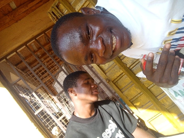 Two African men stand closely together outdoors. One smiles broadly, his dark skin glistening. He wears a white shirt with gold and blue trim. He holds a bottle in his hand. The other man, dressed in a black t-shirt, stands with his head slightly tilted back, eyes closed, as if relaxing in the sunlight. A barred window structure creates a background effect behind them, with wooden planks visible. The light conditions are bright.