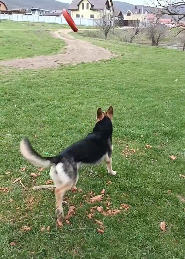 medium-sized dog running in a grassy field. Initially, the dog stands facing the camera, with someone off-screen holding a red toy. The toy is thrown, and the dog runs after it. The dog picks up the toy, an orange ring, and carries it back towards the person who threw it. In the background, there is a dirt path, a house, and a hill. Scattered wood debris is visible on the grass. Someone can be heard asking if someone else has seen their phone.