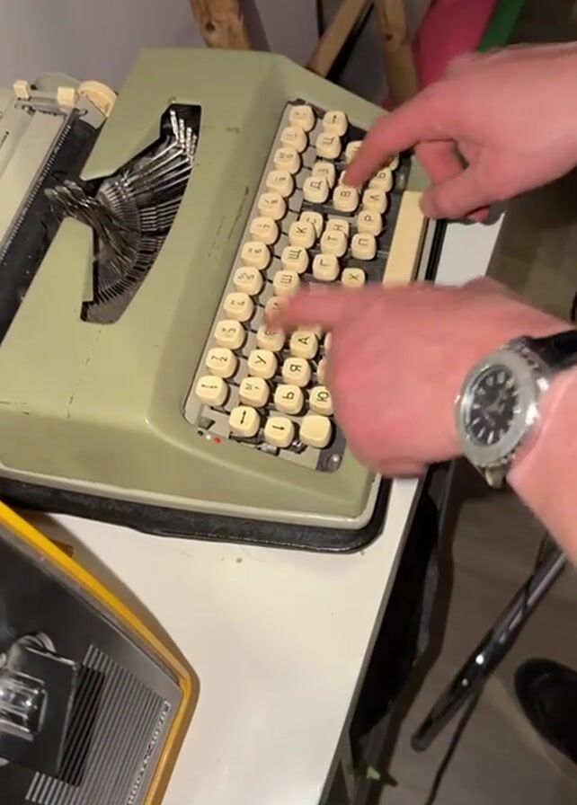 pair of hands typing on a vintage, light green typewriter. The typewriter has round, cream-colored keys with Cyrillic characters. The person's hands move across the keyboard as they type, and a wrist watch is visible on their left wrist. To the left of the typewriter is a partially visible yellow object. The setting appears to be indoors on a white table. In the background, there's what appears to be a piece of bamboo-like furniture and some soft goods in pink and green.