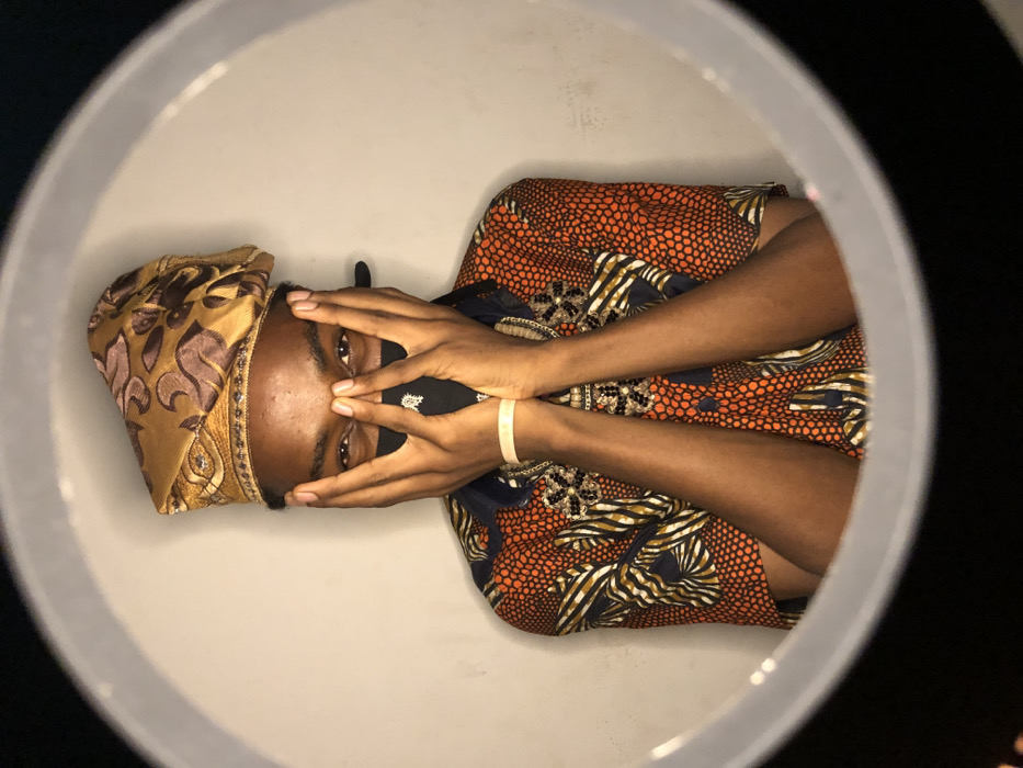 A person with dark skin is centered in the frame, wearing a patterned shirt in shades of orange, black, and white, and a patterned hat in gold and brown tones. Their hands are raised, partially covering the face, with eyes visible above. A white bracelet is on the wrist. The composition is framed within a ring light, casting a bright, soft illumination. The background is a neutral color, with the outer edges fading into darkness.