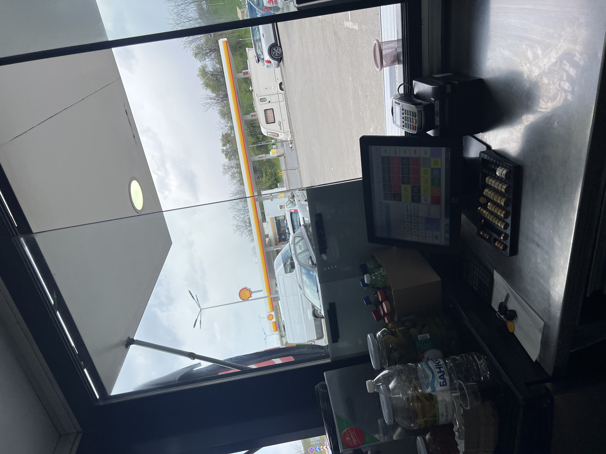 The image depicts the interior of a kiosk or shop at a Shell gas station in Ruse, Bulgaria, as evidenced by the Cyrillic lettering on the water bottle ("БАНКА") and the Shell gas station canopy and signage visible through the window