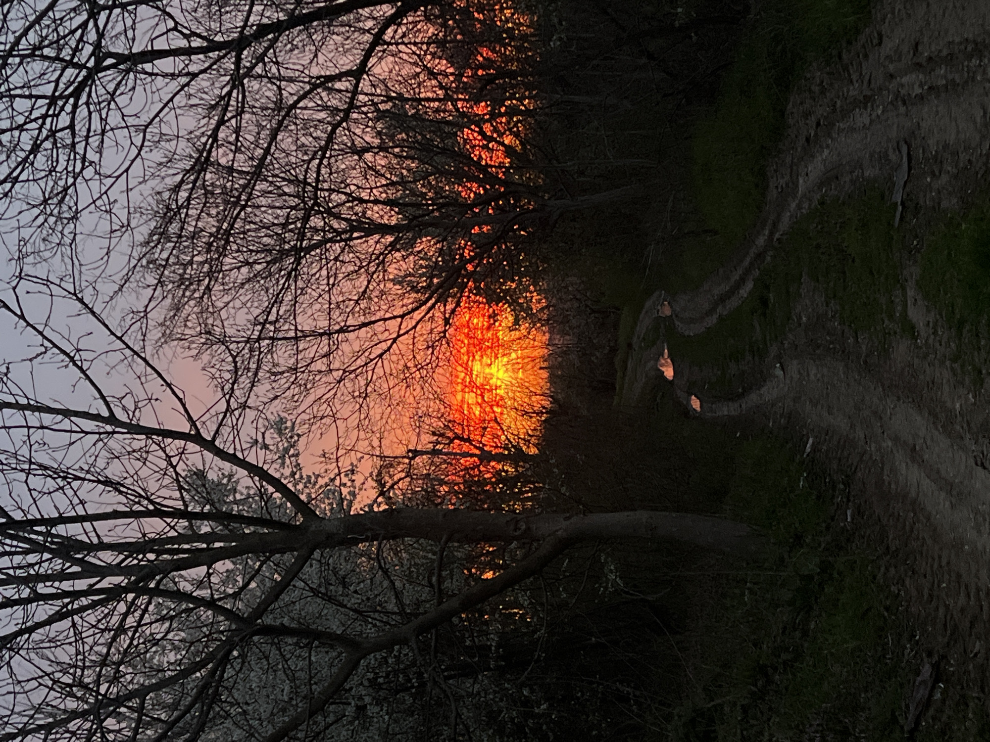 The image depicts a path through a wooded area. The path is dirt and appears to be well-worn, showing tire tracks. The trees are bare, suggesting it is either late fall or winter. A vibrant orange glow is visible in the distance, possibly from the setting sun. The location is likely in a park or wooded area on the periphery of Ruse, Bulgaria. There are no people visible in the frame. The photo is rotated and appears to be taken at dusk.