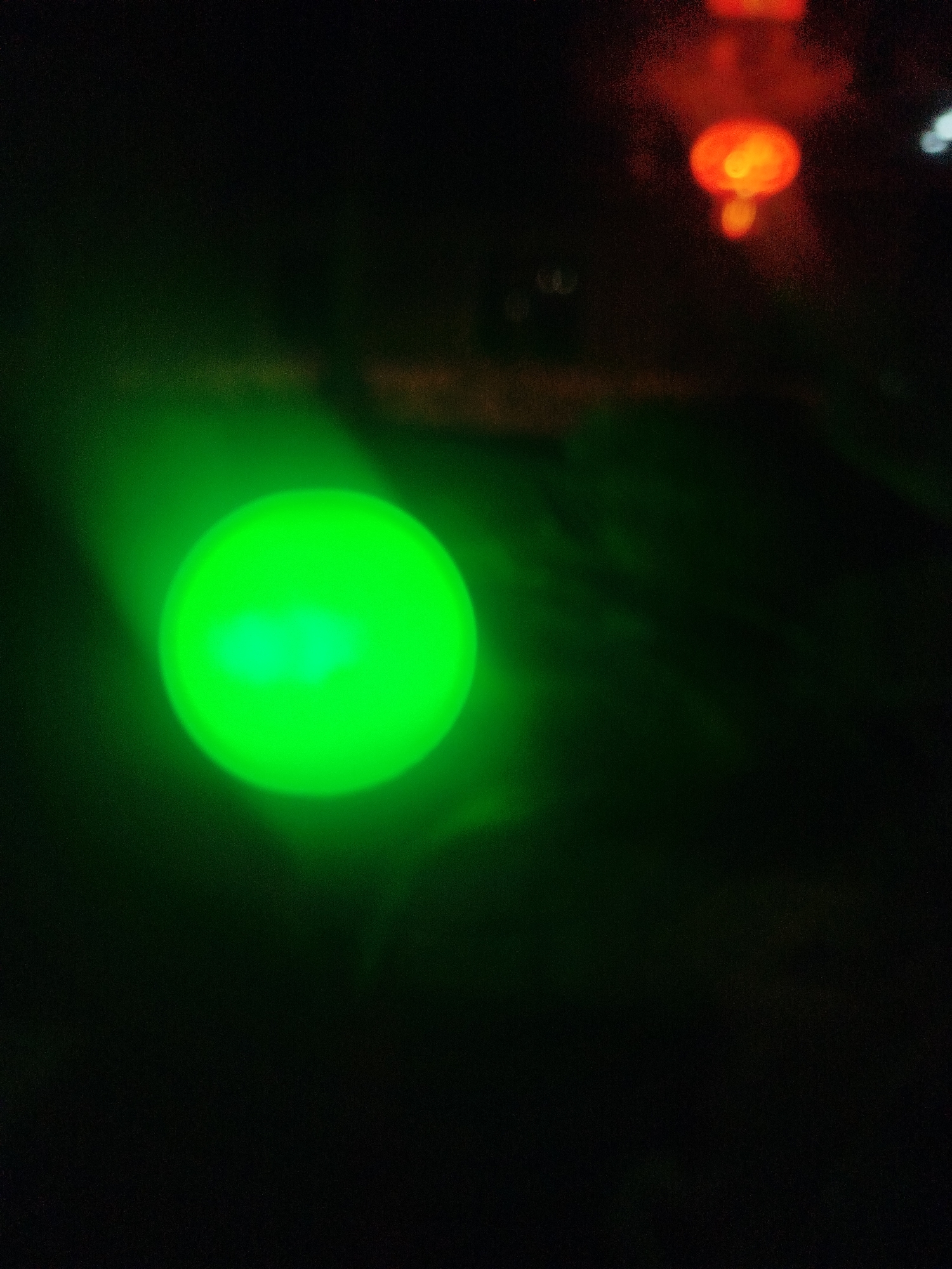 The scene, set in Keffi, Nigeria, is predominantly dark, indicating extremely low ambient light conditions. A primary, intensely luminous, circular green light source occupies the mid-left area of the frame, emitting a radiant glow. In the upper-right background, two secondary, out-of-focus light sources are visible, appearing as indistinct orange and red blurs. No individuals, specific architectural features, or identifiable objects other than these light sources are discernible within the frame.