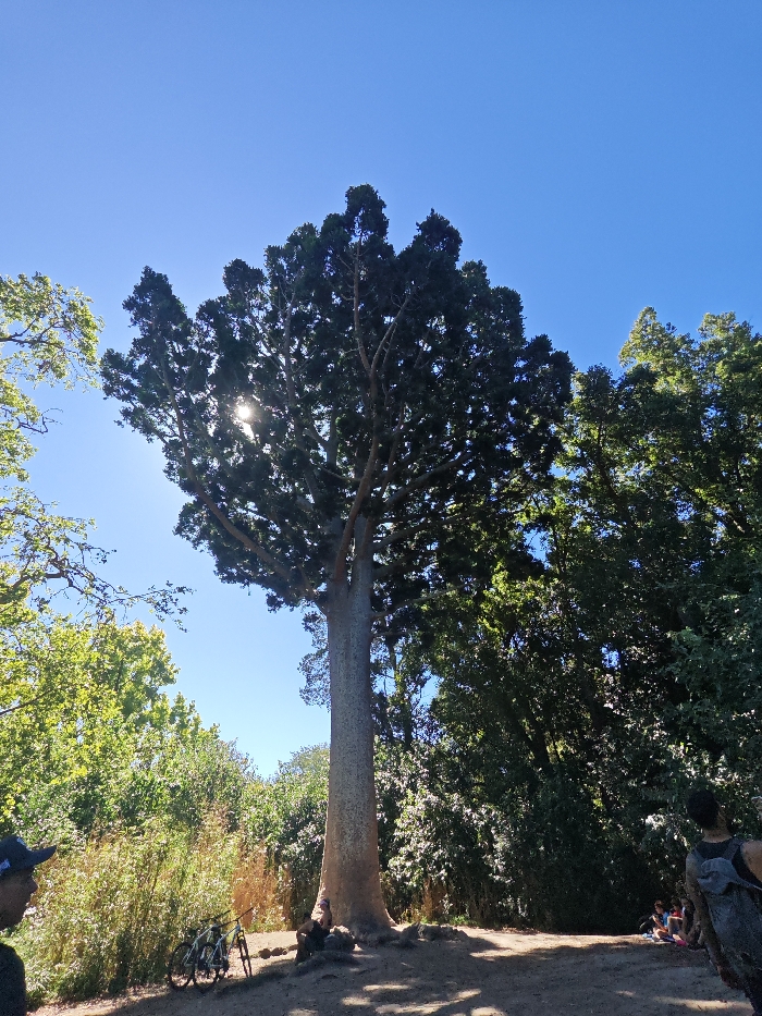 A large, towering tree with a thick, light-colored trunk and a dense, dark green canopy stands prominently in a park-like outdoor environment under a clear blue sky in Pereyra, Argentina. Sunlight filters through the upper foliage, creating a sunburst effect. Surrounding the central tree are various other green trees and bushes. The ground is dirt, showing areas of shadow and direct sunlight. In the immediate foreground, to the left, the top of a person's head wearing a dark cap is visible. At the base of the large tree, a single individual is seated, partially obscured. Two bicycles are parked upright in the mid-ground, to the left of the main tree. Further in the background, to the right, a group of approximately four to five individuals is seated or resting on the ground amidst the vegetation. Another person's back, wearing a dark top and a grey backpack, is visible in the bottom right corner, facing towards the group.