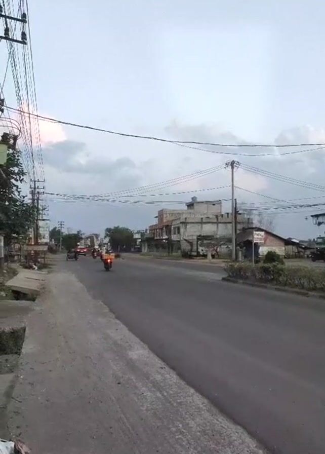 straight asphalt road in a rural or suburban area. The sky is overcast, and it appears to be dusk or early morning. Power lines run along one side of the road, supported by utility poles. A sidewalk runs parallel to the road on the left side. On the opposite side, some low shrubs and small plants divide the road from a line of single and multi-story buildings in the distance. A few vehicles, including motorcycles and cars, are traveling on the road. There are few people visible.