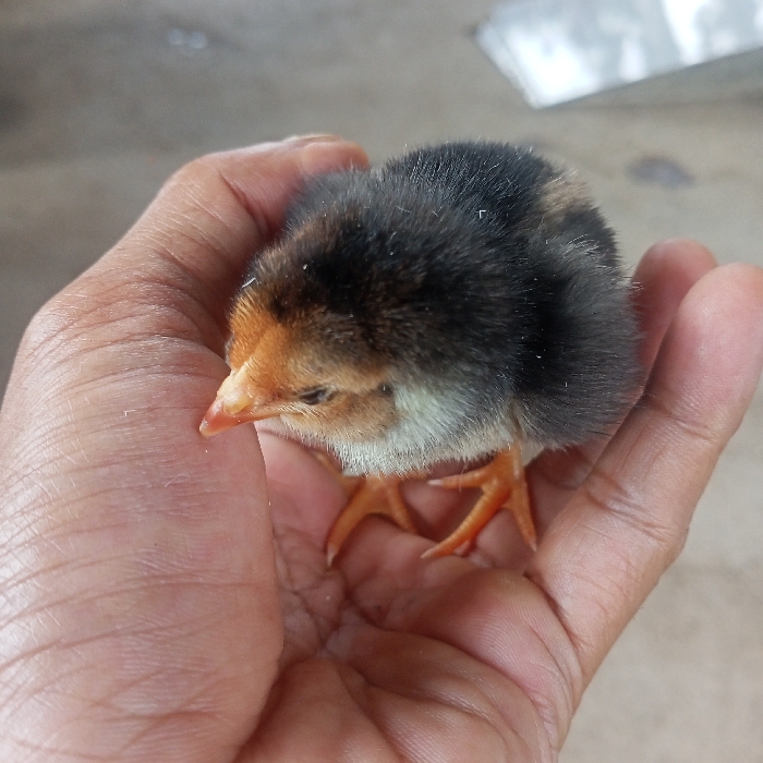 - "A tiny chick, predominantly black with hints of brown and yellow on its head, rests comfortably in the palm of a hand" by FM-cHJi83, licensed under CC BY 4.0