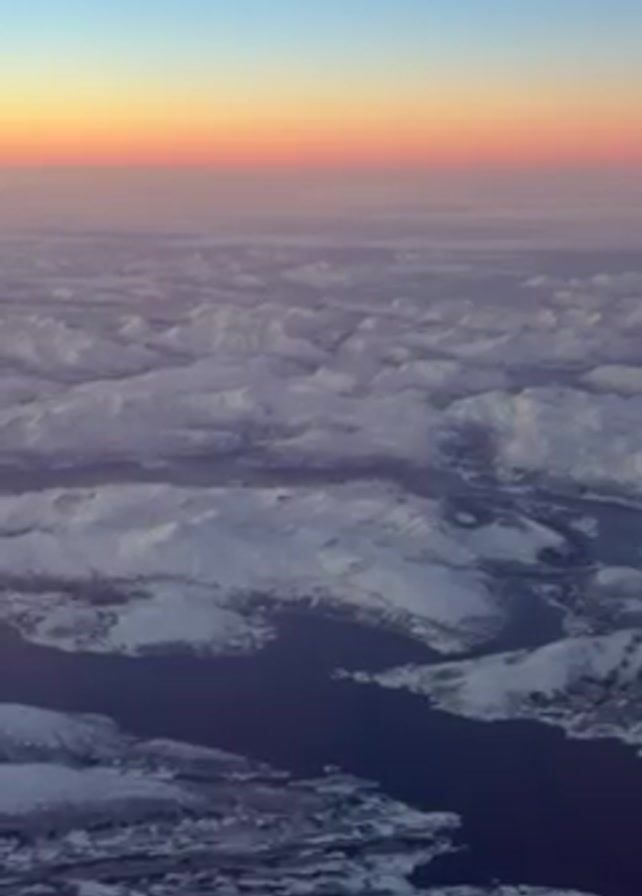 n aerial view of snow-covered mountains and dark bodies of water, possibly fjords, at what appears to be sunrise or sunset