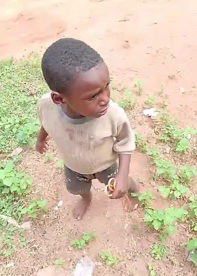 young boy, possibly three to five years old, standing in a dirt clearing with sparse grass. He is barefoot, wearing a light brown long-sleeved shirt and dark shorts. He is crying, with tears visible on his face. In his right hand, he holds a pair of what appear to be small, golden-colored hoops. The background is primarily reddish-brown dirt and some green foliage. There also appears to be some discarded cloth or material in the scene. The camera angle is from above, looking down at the child.