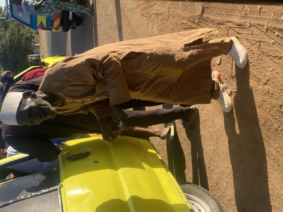 An elderly man, appearing to be of African descent, stands on a reddish-brown dirt road in Kakuri Gwari, Nigeria. He wears a white skullcap and a long-sleeved, collared brown tunic (jalabiya) with white buttons down the front and slits on the sides, paired with white sneakers. His face shows visible wrinkles, and he has a short beard. He holds small, light-colored objects, possibly paper or currency, in both hands, positioned at waist level. His gaze is directed towards the left of the frame, with a slight smile or grimace. Immediately to the man's left is the bright yellow side of a passenger van, which has its sliding door open. Partially visible within and around the open door are other individuals, primarily obscured, including a person in dark trousers and light-colored sandals whose bare feet are visible on the dirt ground. Further in the background, on what appears to be a paved road, a blue and white vehicle with red and yellow diagonal striped markings and an "X" symbol is parked. Another individual in a patterned blue and white garment is visible near this background vehicle. Long shadows are cast across the dirt ground, suggesting direct sunlight from a low angle. The ground is uneven, displaying tire tracks and scattered debris.