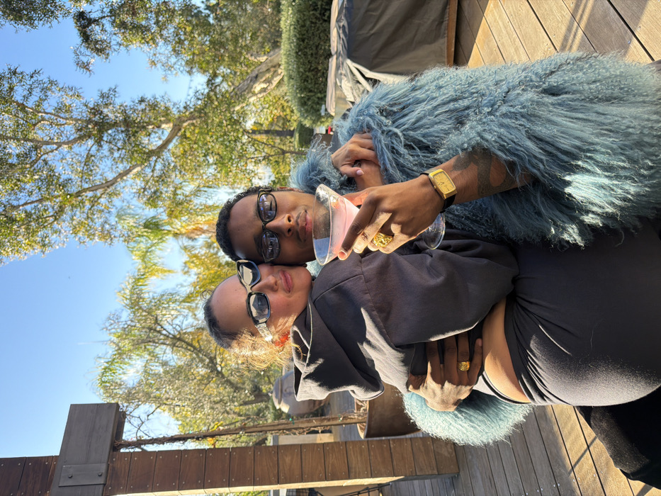 A couple poses closely outdoors, likely on a deck. The man, wearing glasses and a fuzzy blue coat, holds a pink cocktail and sports a gold watch. The woman, with sunglasses, is in a dark outfit. They both have gold rings. The background features trees and a blue sky, suggesting a sunny day. The photo is taken at an angle, with a slight tilt to the left.