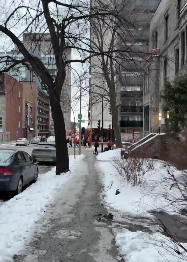 sidewalk in a city. The sidewalk is partially covered in snow and ice. There are buildings on either side of the sidewalk, and cars are parked on the street. There are several people walking near the intersection. The traffic light is green. The sky is overcast.