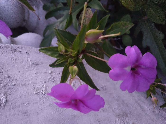 - "This image depicts a close-up of two vibrant purple flowers, identified as Impatiens, growing against a textured, light-colored concrete or stucco wall in Ciherang, Indonesia" by FM-6k6Sh1, licensed under CC BY 4.0